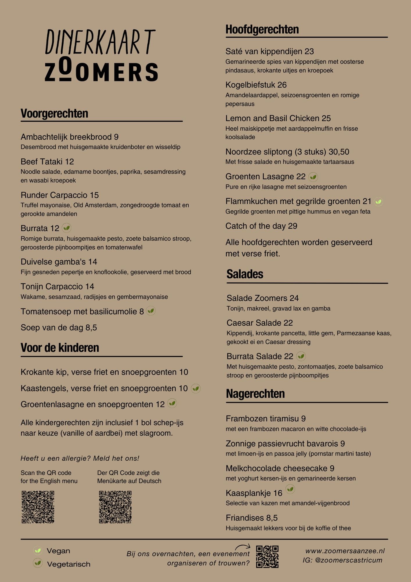 Bekijk hieronder onze actuele menukaart en laat je inspireren door verrassende smaken, mooie ingrediënten en de ontspannen sfeer van Zoomers Castricum. Hét strandpaviljoen voor fijnproevers en strandliefhebbers om heerlijk te eten aan de kust.